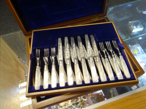 GOOD EDWARD VII SILVER & MOTHER OF PEARL HANDLED BOXED SET OF FRUIT KNIVES & FORKS FOR 12 in Elkington & Co. mahogany box, the blades engraved 'Sheffield 1901'