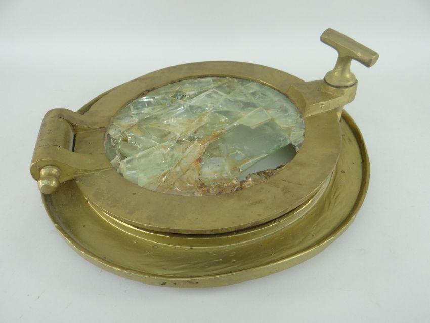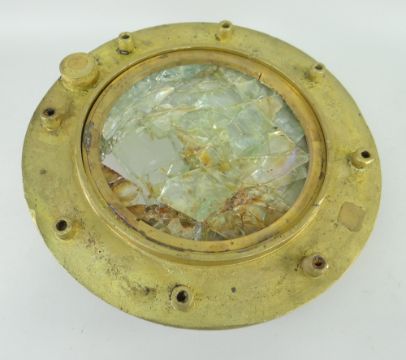 HEAVY BRASS PORT HOLE with glass centre (damage), purportedly raised from the wreck S.S Schiller, sunk off the isles of Scilly in 1875 (accompanying letter), 36cms diameter