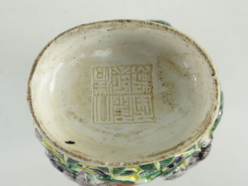 CHINESE FAMILLE VERTE BISCUIT VASE moulded in high relief with Buddist lions amid clouds and brocade balls, stiff leaf collar and foot base with carved six character Kangxi mark, late 19th Century, 20cms high (neck chipped)