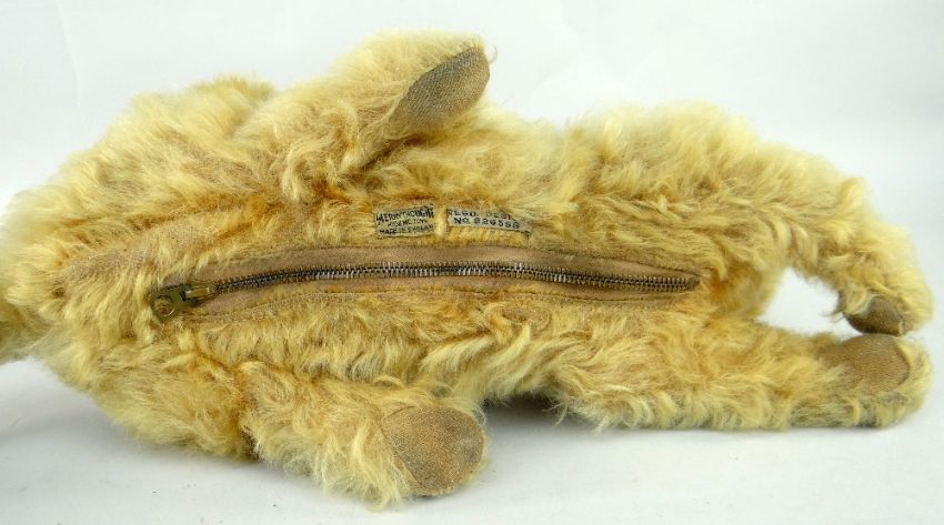 MERRYTHOUGHT CAT PYJAMA-CASE no. 826566 and unknown maker English teddy-bear with growler (possibly by Chiltern), same ownership for 79 years