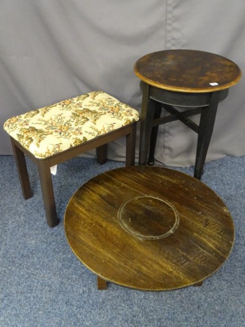 VINTAGE FURNITURE - three items including a circular top table with under-tier shelf, 74cms H, a 76cms D coffee table and an upholstered top piano stool