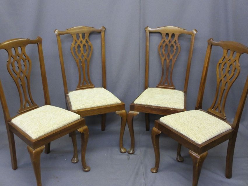MAHOGANY DINING CHAIRS, a set of four, high back with pierced splats and carved top rail, drop-in upholstered seats on cabriole front supports, 101cms H, 47cms W, 38.5cms seat depth