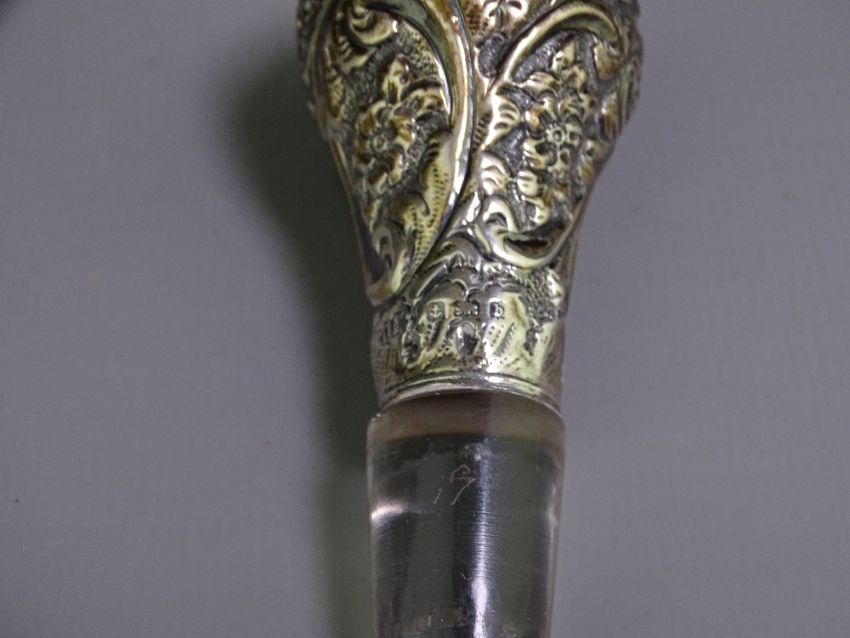 SILVER MOUNTED PINCHED WAIST DECANTER, swirl form glass with pierced shoulder mount, flared collar and embossed stopper, Birmingham 1901, indistinct maker's mark, 28cms overall H