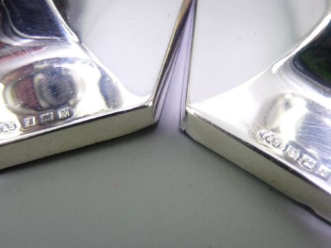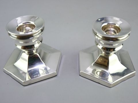 HEXAGONAL BASED SQUAT CANDLESTICKS, a pair, Birmingham 1963, maker Turner and Simpson with removable sconces, 6cms H