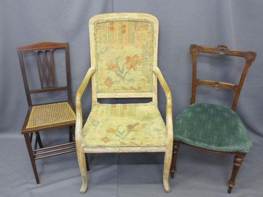 VINTAGE OCCASIONAL CHAIRS X 5 including a French style lime washed armchair, an Edwardian salon chair on turned supports and a cane seated mahogany bedroom chair along with two regency mahogany side chairs