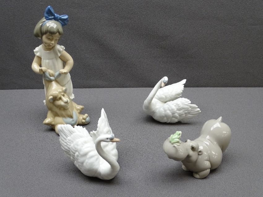 NAO - a young girl with a lion, a hippo with a frog on its nose and a pair of Lladro white swans