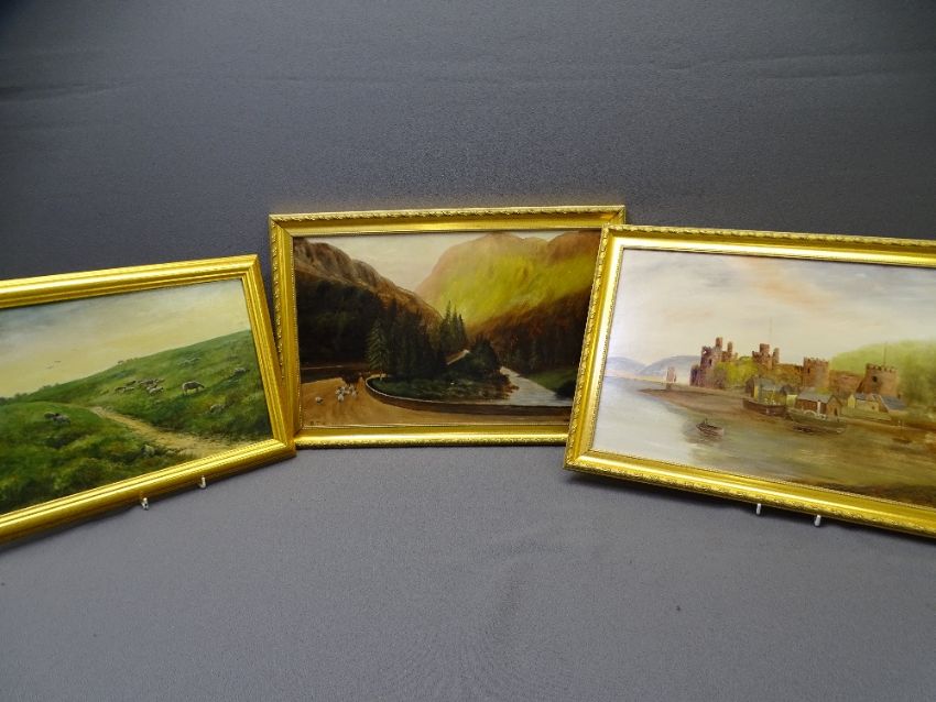 R CLARKE oil on board - heathland path with sheep grazing, 23.5 x 33cms and two further OILS ON BOARD - North Wales scenes in gilt frames, 28 x 44.5cms