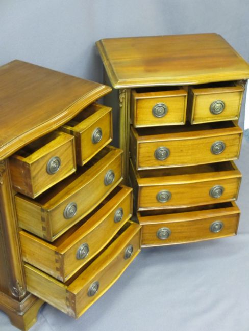 REPRODUCTION MAHOGANY BEDSIDE CHESTS, a pair, having two small over three larger drawers with ring-pull handles on plinth bases, 69.5cms H, 49cms W, 38cms D