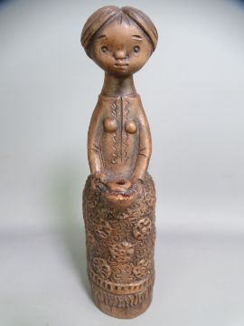 MARGIT KOVACS POTTERY FIGURINE of a young girl holding a jug, incised monogram to the base, 23cms H (small chip to front of jug)