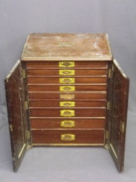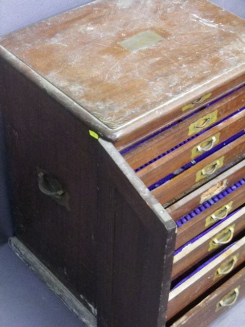 VICTORIAN MAHOGANY TWO DOOR CUTLERY CABINET on nine interior drawers with inset brass handles, 63.5cms H, 51cms W, 42cms D