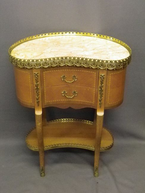 FRENCH EMPIRE STYLE KIDNEY SHAPE SIDE TABLE having twin concave front drawers and under-tier shelf, the marble top with pierced brass gallery, 75cms H, 58cms W, 32cms D