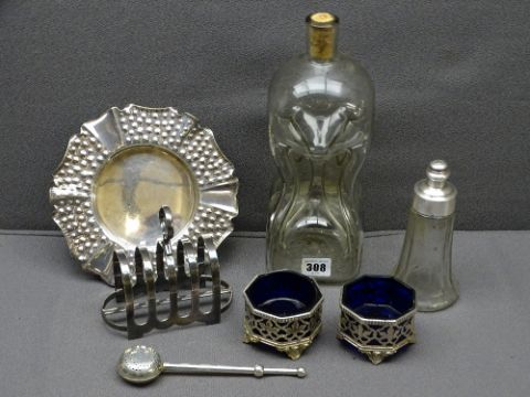 HUKIN & HEATH PLATED DISH, pair of salts, Haig and Haig bottle ETC