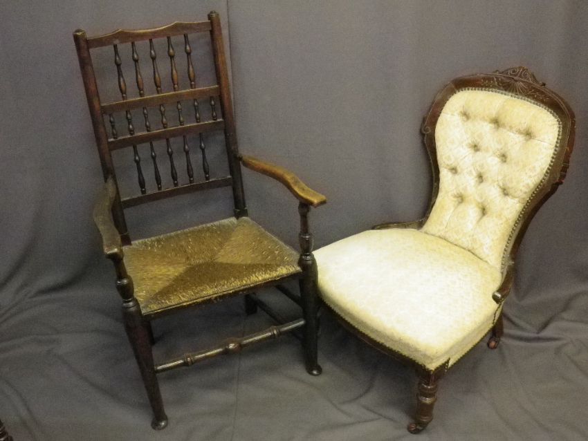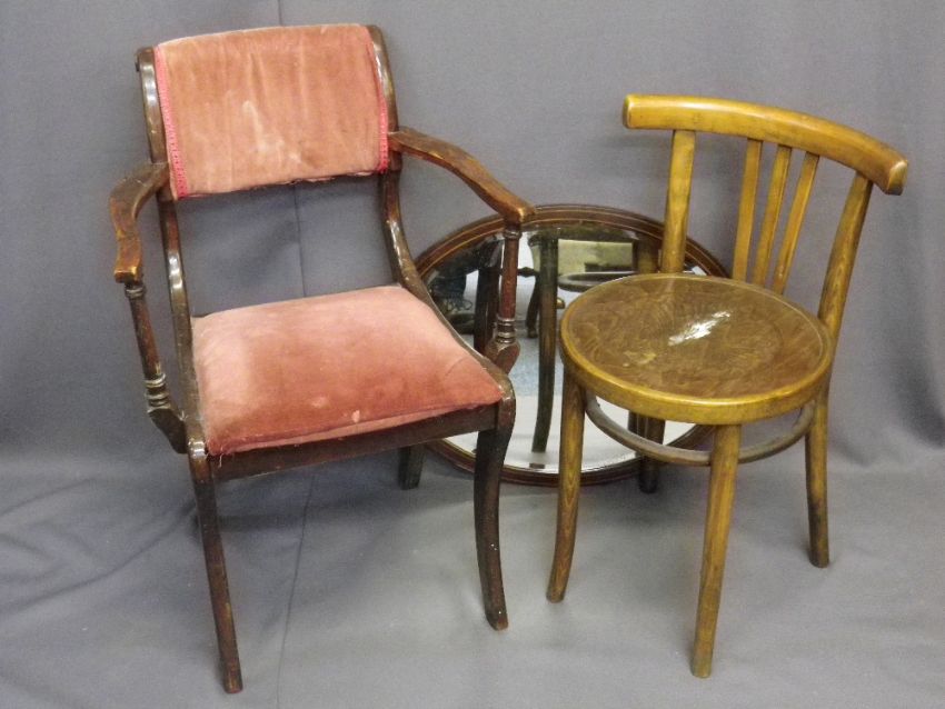 FOUR ANTIQUE & LATER CHAIRS and a mahogany string inlaid oval wall mirror to include an Edwardian button back upholstered salon chair, a bentwood side chair and a rush seated spindle back armchair, various measurements