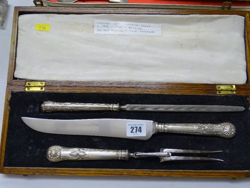 SILVER HANDLED THREE PIECE CARVING SET IN WOODEN CASE