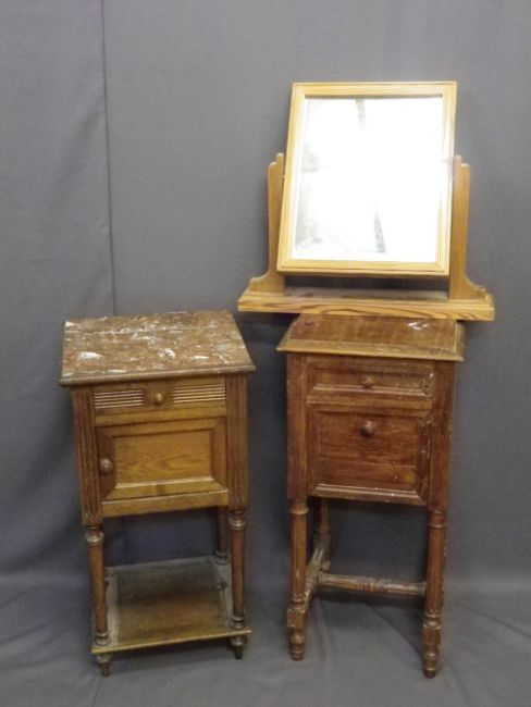 TWO FRENCH STYLE POT CUPBOARDS and a modern pine toilet mirror, 80cm, 76.5cm and 52cm heights