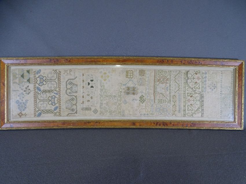 COMPLEX LONG ABSTRACT & FLORAL SAMPLER, unnamed but dated 1665, 87 x 21cms (the fabric has a stitched join down the centre)