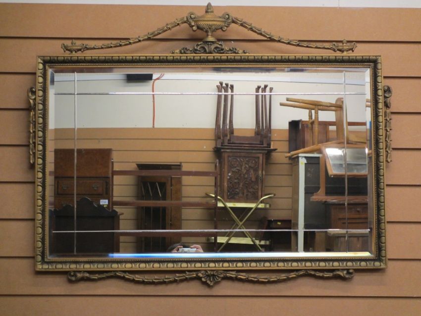 GILT FRAMED WALL MIRROR with urn and swag detail and bevelled edge glass, 76 x 97cms