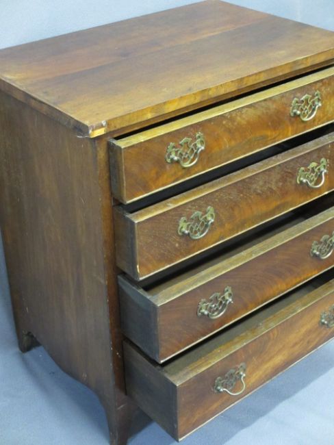 NEATLY PROPORTIONED REPRODUCTION MAHOGANY CHEST of four drawers with pierced fancy back plates and swing handles on swept corner feet, 63.5cms H, 56cms W, 37.75cms D