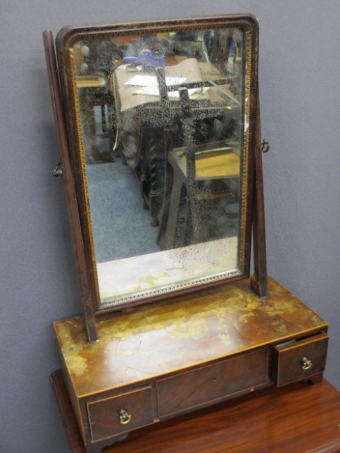 REGENCY MAHOGANY SWING TOILET MIRROR and a pot cupboard in mahogany having a double swan neck top rail and carved front door panel, 59 and 89.5cm heights respectively