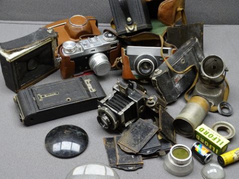 VINTAGE CAMERAS & ASSOCIATED EQUIPMENT, a quantity including a Kochmann Korelle P Vest pocket plate camera, strut folding bellows type with F Deckel, Munchen, Compur lens, the rear of the hooded focus screen marked 'Zeiss Ikon' with a quantity of plate holders and a Rollex patent roll film converter