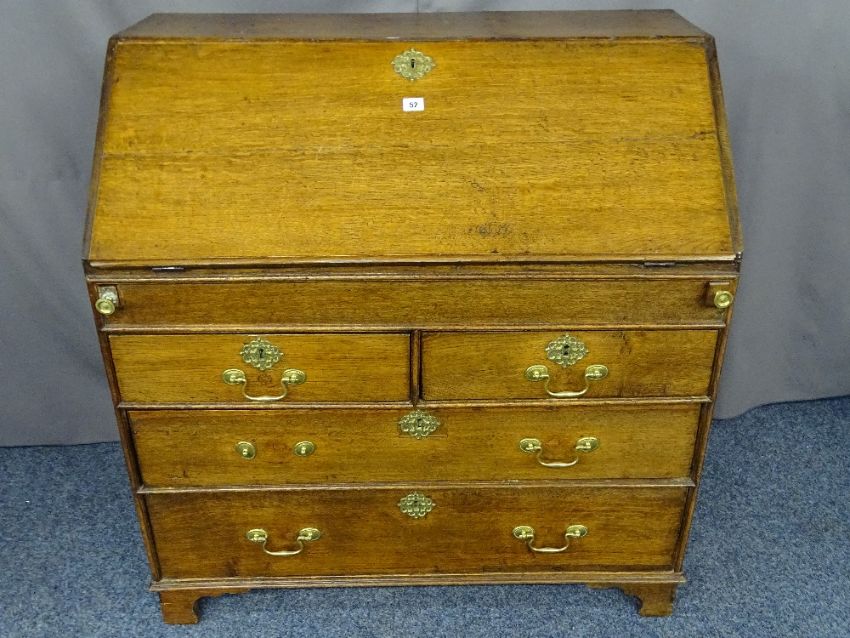 A GEORGIAN OAK FALL-FRONT BUREAU with interior sliding well and mixed drawer and pigeonhole arrangement, over two short and two long drawers, on corner bracket feet, (brassware replaced to the oak lined drawers, some past restorations apparent), 100cms H, 97cms W, 54.5cms D