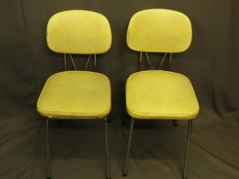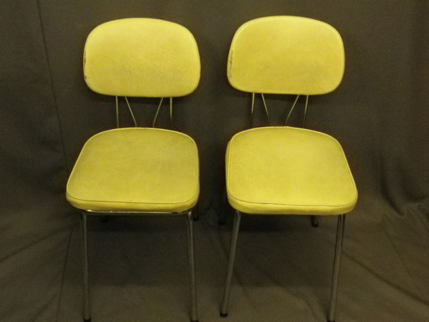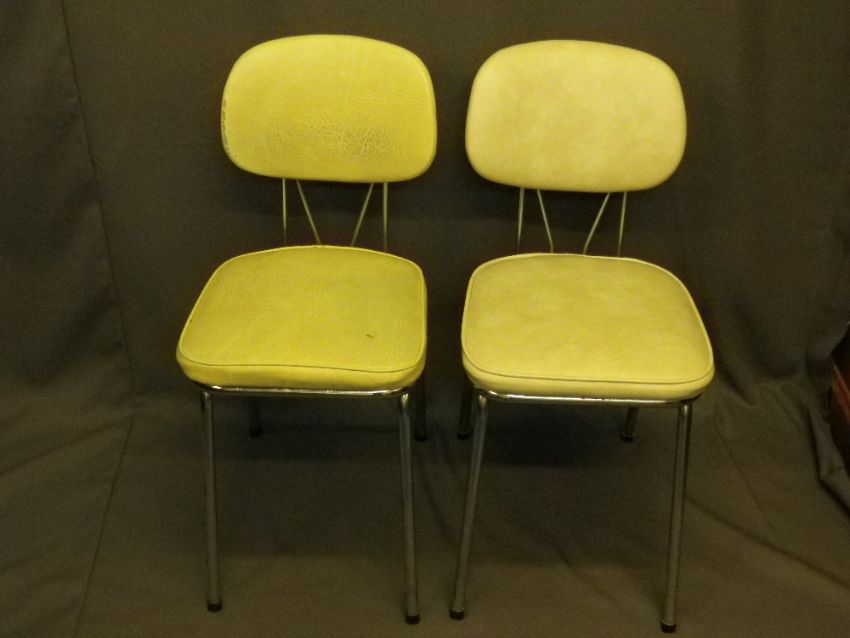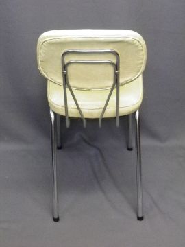FOUR STYLISH MID-CENTURY KITCHEN CHAIRS, chrome bar frames with rexine upholstered seats and backs, 75cm heights