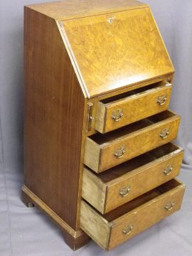 REPRODUCTION BURR WALNUT FALL-FRONT LADY'S BUREAU with four drawers on corner bracket feet, 100cms H, 54cms W, 43cms D