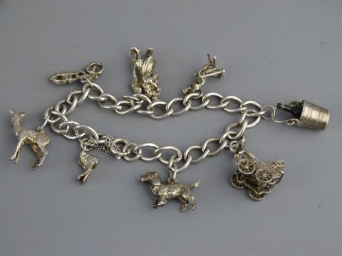 SILVER CHARM BRACELET with eight charms, 34grms gross
