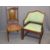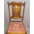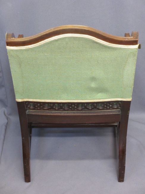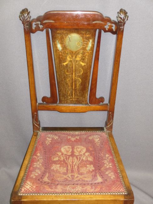 TWO VINTAGE SALON CHAIRS including a closed side armchair with pierced detail, Chinese style, 82cms H, 57cms W, 46cms seat D, the other being slightly Art Nouveau with carved detail, the central splat inlaid with boxwoods and mother of pearl, 53cms H, 45cms W, 40cms seat D
