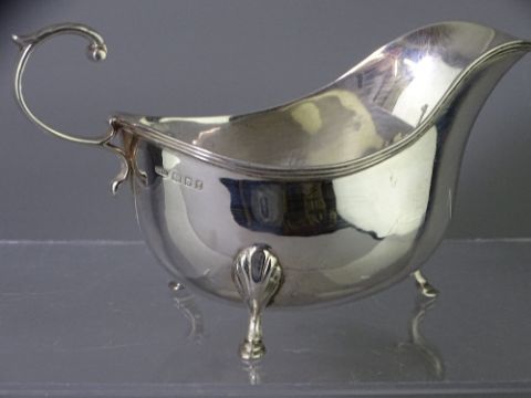 ASPREY LONDON SILVER SAUCE BOAT with scroll handle on three hoof feet, London 1921, 5.4 troy ozs, 18cms L