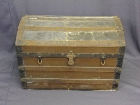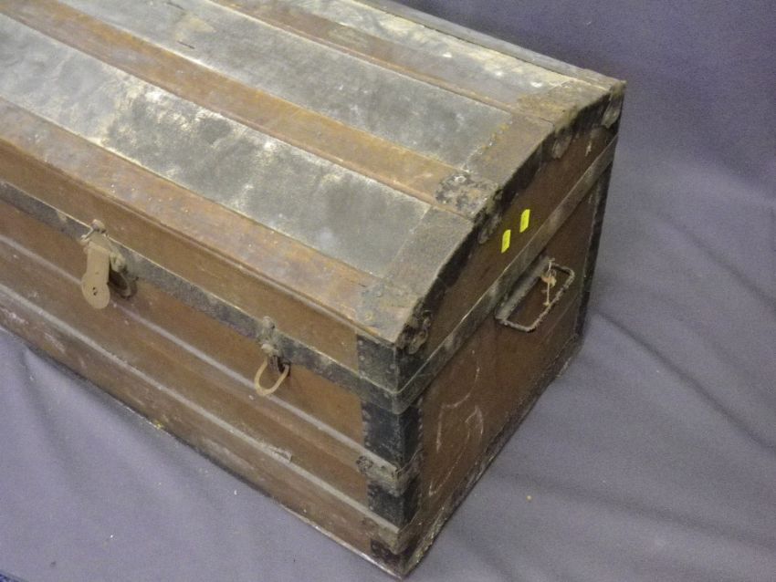 VINTAGE METAL BOUND DOME TOP TRAVEL TRUNK, 50cms H, 75.5cms W, 43cms D