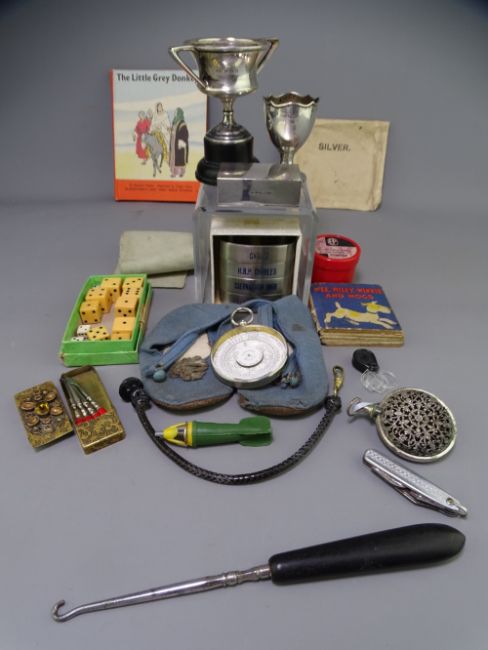 SMALL SILVER & MIXED VINTAGE COLLECTABLES including a pair of child's shoes, a quantity of dice, gilt metal cased manicure set ETC, 3.8 troy ozs weighable silver