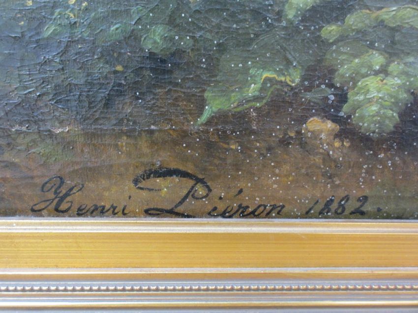 HENRI PIERON fine oil on canvas - continental coastal or riverscape with two cattle sheltering from the sun under two trees with nearby buildings, signed and dated 1882, 77 x 120cms