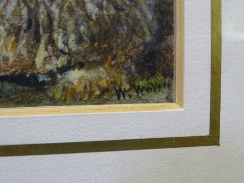 WILLIAM WATSON watercolour - a resting ram and sheep by rocks, signed with original career descriptive labels verso, 9.5 x 14cms