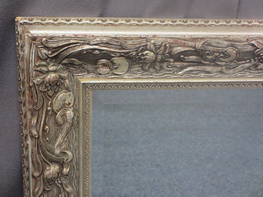 FANCY FRAMED REPRODUCTION OVERMANTEL MIRROR with bevelled edge, 95cms H, 119.5cms W