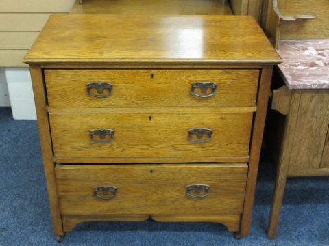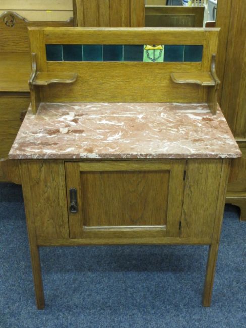 EDWARDIAN OAK FOUR PIECE BEDROOM SUITE, well presented with slight Art Nouveau influences consisting of single mirrored door wardrobe, 206cms H, 101cms max W, 41cms D, tile-back wash stand with pink marble top, mirrored dressing chest and three drawer chest of drawers similarly styled, various measurements the other items