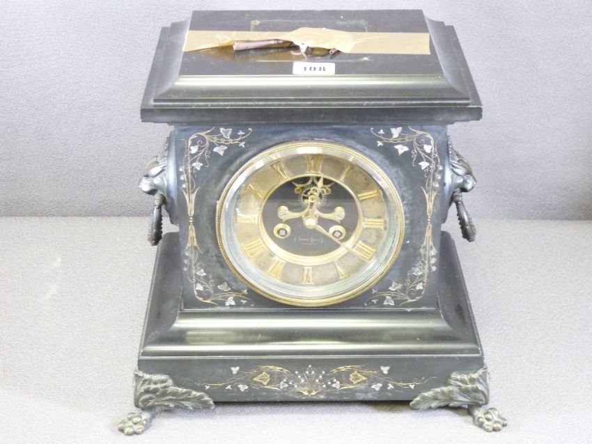 SLATE MANTEL CLOCK with lion head handles on paw feet, marked 'J Lomax & Sons, Manchester', 30cms H, 32cms W, 22cms D
