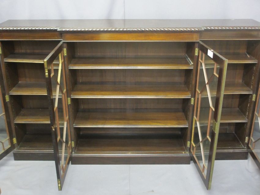 MAHOGANY FOUR DOOR BREAK-FRONT BOOKCASE, edge carved decoration to the top of 13 pane astragal glazed doors with interior adjustable shelves on a plinth base, 115.5cms H, 202cms W, 40cms max D