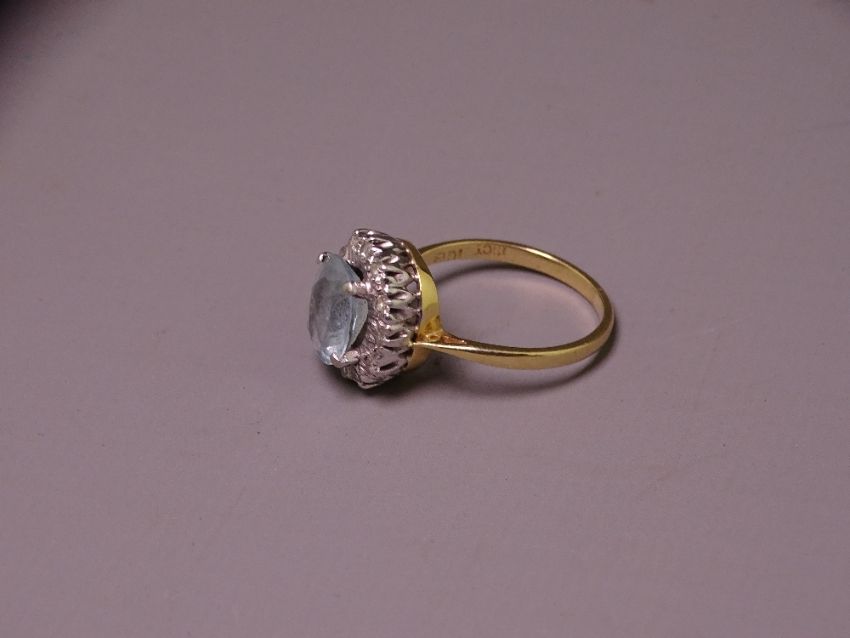 18CT GOLD BLUE QUARTZ & DIAMOND SET RING, 4.9grms, size - O, 8 x 10mm central stone set with four claws and a lower border of twelve small diamonds