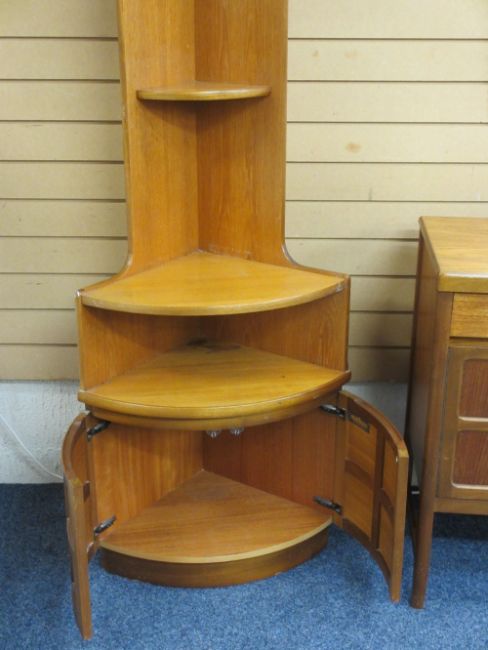 MID-CENTURY TEAK LONG SIDEBOARD, 83cms H, 184cms W, 45cms D, matching corner display unit, probably both Nathan, and a rectangular framed wall mirror