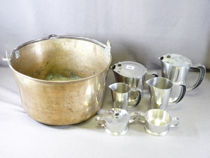 BRASS JAM PAN with iron swing handle, 37cms diameter and a quantity of Hotel service type ware