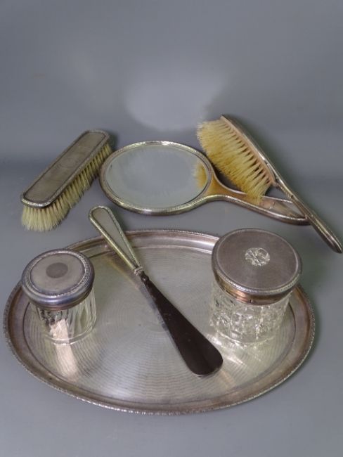 SEVEN PIECE DRESSING TABLE SET including an oval tray, mixed Birmingham hallmarks, 1916-1924, one dressing table pot lid Chester