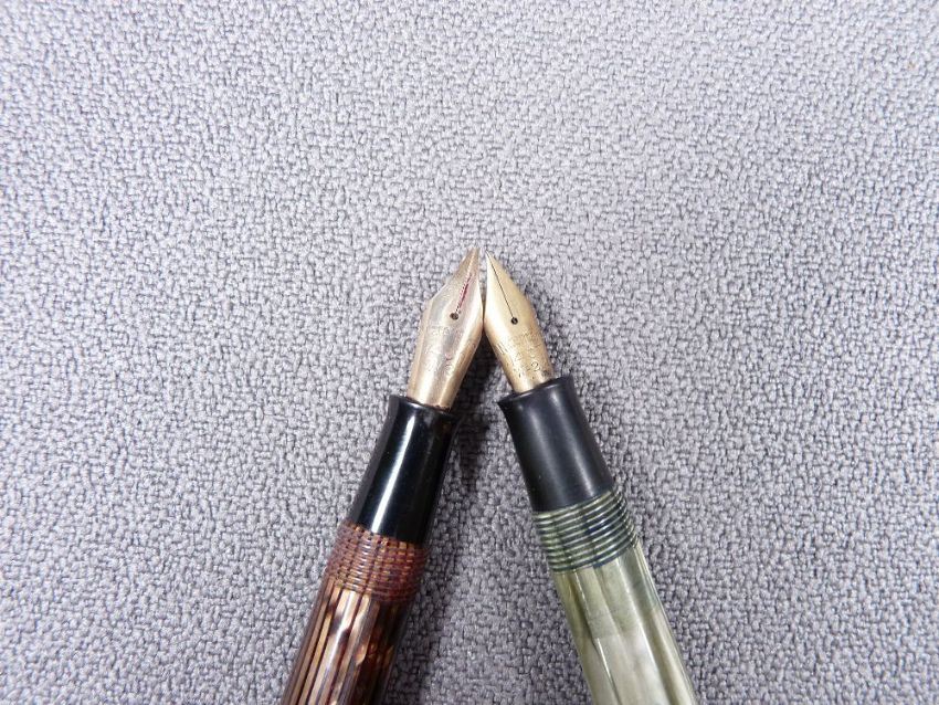 WATERMAN - Vintage 1950s gold Striated Waterman W3 fountain pen with gold trim and original W3 14ct gold nib and a vintage 1950s green pearl Striated Waterman 512V fountain pen with gold trim and 14ct gold nib (W-2A)