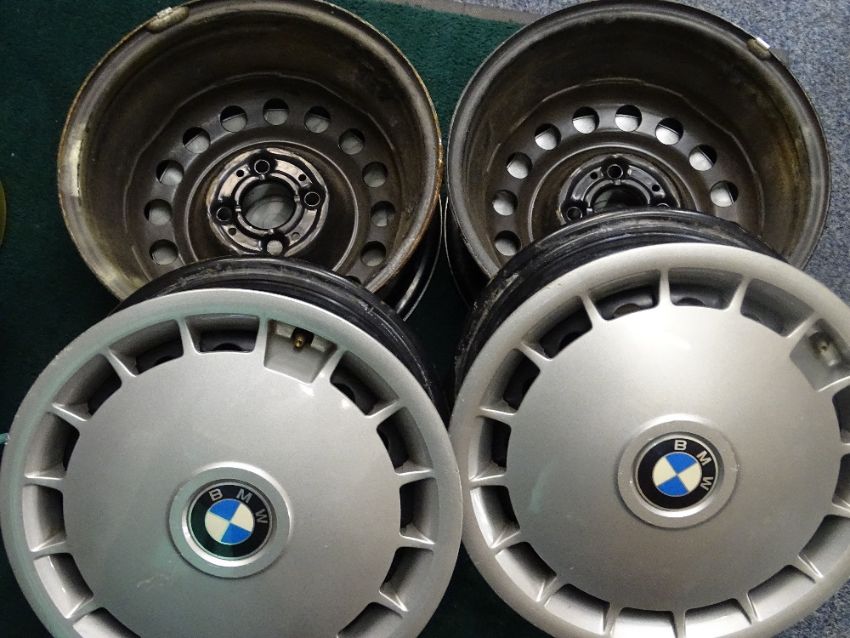 SET OF FOUR BMW WHEELS with clip-on plastic trims (see image for sizes)