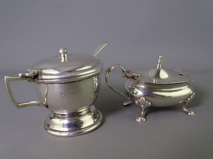 TWO SILVER MUSTARD POTS with liners, 1936 Gieves Ltd and 1962 John Rose with spoon, 99 grms gross