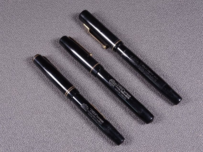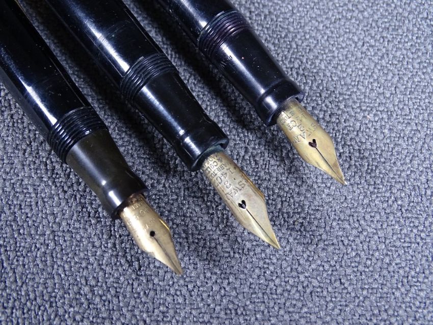 MABIE TODD - Three vintage (1930s-1940s) black Swan Mabie Todd fountain pens with gold trim and 14ct gold nibs, 1. Black Minor No 2 (SM2/60) self-filler fountain pen with 14ct gold Swan nib (No 2), engraved 'K MYCOCK' on barrel, 2) black SM 112B/60 self-filler pen with Empire-style stepped clip of the washer type with 14ct gold 'Warranted' nib, 3) un-numbered self-filler fountain pen with (replacement?) 14ct gold Swan nib (No 2)