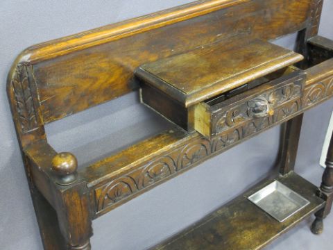 CARVED OAK HALL STICK STAND, reduced height with lion mask central drawer and turned front supports with dual drip trays, 95cms H, 102cms W, 23cms D