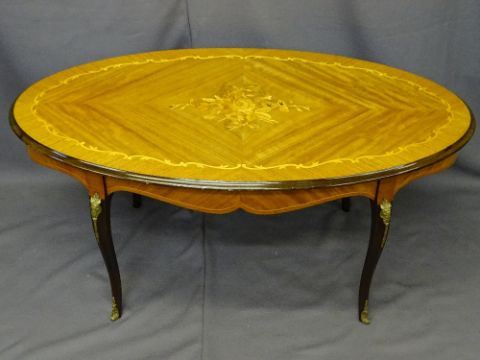 ITALIAN INLAID OVAL COFFEE TABLE with gilt metal mounts, 49cms H, 107cms L, 58.5cms W