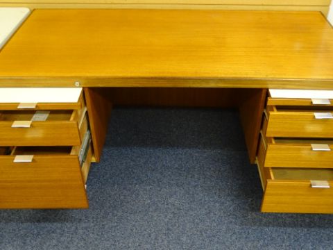 MID CENTURY TEAK OFFICE DESK with aluminium handles on chrome supports, 72cms H, 180cms W, 90cms D