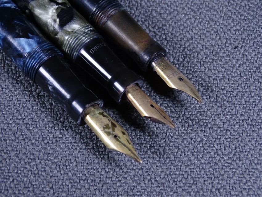 MABIE TODD - Vintage (late 1920s-1930s) russet and jade Swan Mabie Todd SM 100/63 self-filler with nickel trim and original 14ct gold Swan nib (No 1), some discolouration to cap and chipped barrel end, in Swan 'Repair Box', a vintage 1930s light blue/dark blue marble Blackbird Mabie Todd 5242 self-filler fountain pen with nickel trim and replacement 14ct gold nib marked 'Canada' and a vintage 1930s grey/green marble Blackbird Mabie Todd 5245 self-filler fountain pen with nickel trim and original 14ct gold Blackbird nib